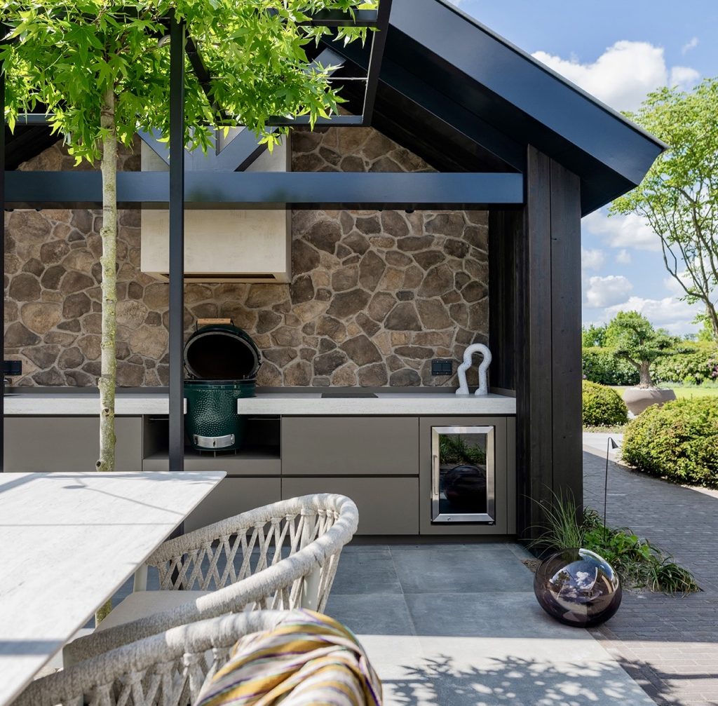 Featuring a rich charcoal color and a stone wall background, this luxurious and modern kitchen is a true outdoor experience with professional-grade appliances and a grill. The layout is smartly designed, as there is a long, seamless counter that is a great place to prepare meals, and the grill is a kamado cooker with lots of options, including ideas we anticipate for 2026 with built-in Blackstone griddles. Homeowners that want a seamless, sleek, and dramatic modern kitchen that requires low maintenance in the open air and in the shade will appreciate this design the most.