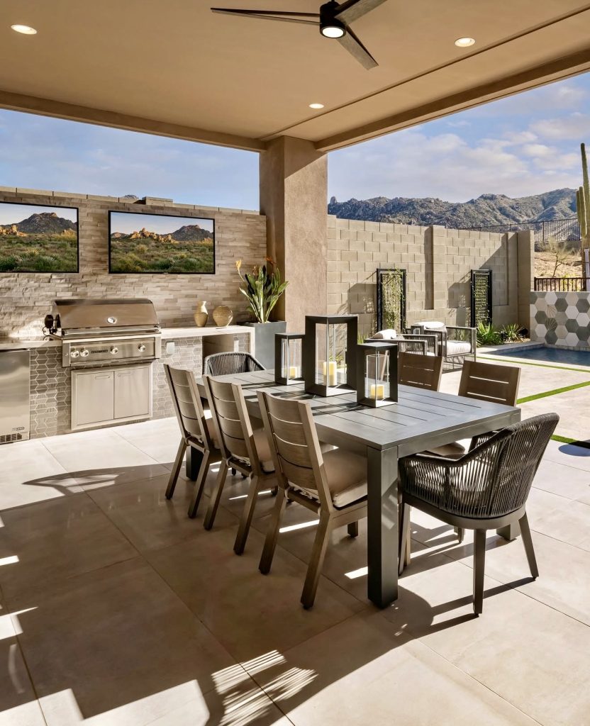 This kitchen feels like a destination—no extra effort needed. The contemporary dining setup extends from the grilling station, making it perfect for hosting long dinners and holiday gatherings. The sleek fan, clean countertops, and muted tones give it a modern edge while still feeling warm and inviting. The built-in wall televisions and large dining table elevate the space into a full outdoor living and dining area. It’s also a great inspiration point for anyone with a backyard that needs both cooking and lounge capabilities. One practical detail worth stealing: the layout doubles as a shade structure without fully enclosing the space, ideal for hot regions or tropical climates.
