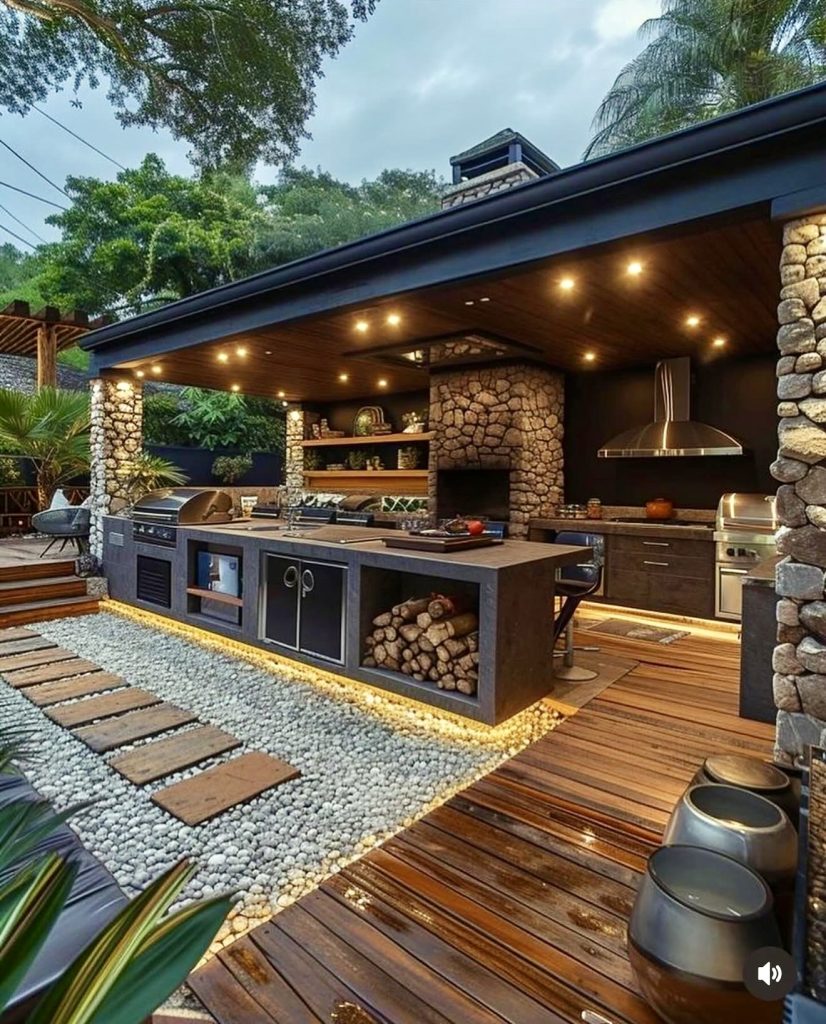 Design lovers who appreciate natural materials will be drawn to this rustic stone-clad outdoor kitchen, which blends lodge-like charm with contemporary luxury touches such as under-counter lighting and smooth concrete surfaces. The wide layout grill area plan includes storage for firewood, multiple cooking stations, and a dedicated zone for prepping larger meals, aligning perfectly with backyard BBQ ideas and layout trends for 2026. With warm wood decking and layered stones, this setup offers homeowners powerful inspiration for transforming a basic patio into an atmospheric gathering space.