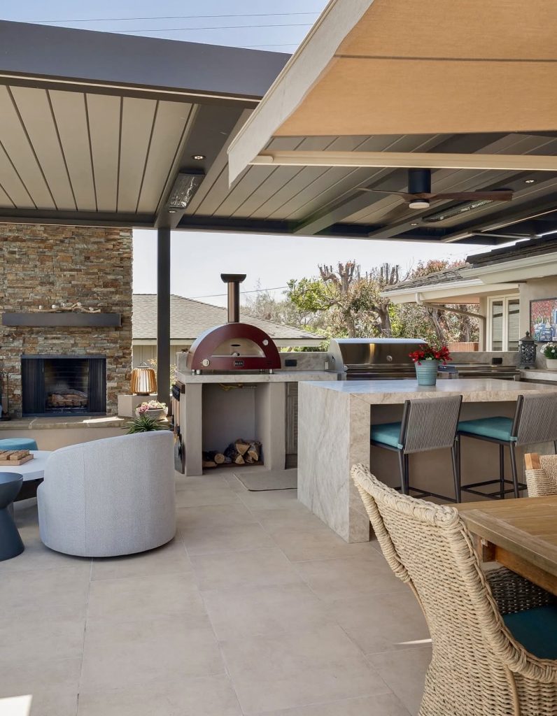 The best part of this design is how effortless it feels—like stepping into a high-end vacation rental right in your own backyard. The stone fireplace, pizza oven, and bar-style seating turn the space into a full entertaining zone where you can cook, sit, and unwind. The attention to materials stands out: wide-slab flooring, weatherproof cabinetry, and soft neutral furnishings that make the space feel premium without feeling too formal. This kitchen is also an example of how to combine multiple functions in one layout: cooking, lounging, and dining coexist without crowding the patio. It’s a fantastic blueprint for the homeowner who wants a modern outdoor hangout but prefers a laid-back environment over a showpiece.
