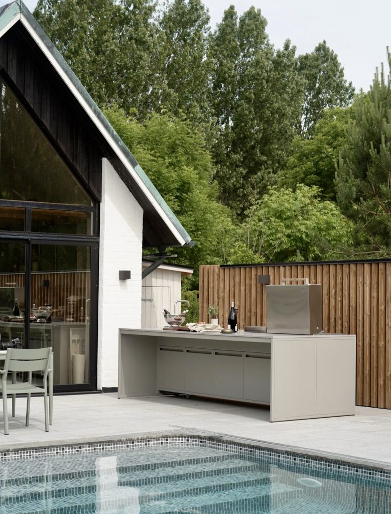 This kitchen embraces the pared-back elegance we’re seeing in 2026—sleek surfaces, neutral tones, and integrated storage that keeps everything tucked away. By tucking the kitchen alongside the pool deck, the design activates what could otherwise be unused space. It’s a brilliant idea for anyone working with a small space or limited yard because it keeps the cooking area separate from the dining or lounge zone without adding barriers or walls. Designers often remind us that great outdoor design is just as much about what you leave out as what you add. Here, simplicity is the luxury—and it creates a calm, cozy backdrop perfect for summer entertaining.
