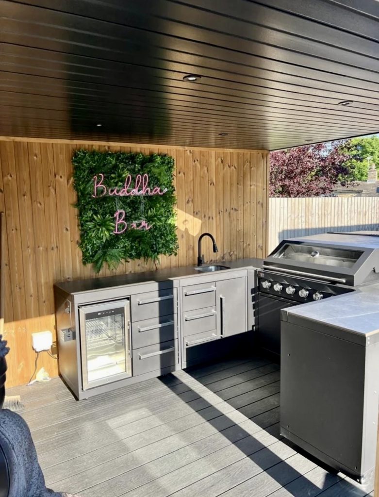 Here’s where personality comes into play. The neon sign and vertical greenery wall instantly set a fun and bold tone for this covered outdoor kitchen. The stainless steel appliances add contrast to the natural wood paneling, making the kitchen feel restaurant-inspired and energetic without being over-designed. This is the kind of space that works beautifully for casual get-togethers—a built-in fridge for refreshments, a clean countertop for prep, and just enough seating for company. If you love the idea of a custom backyard hangout that doesn’t feel too serious, this style is a perfect example of how to blend boho, modern, and boutique bar influences. The whole space radiates that fun “at-home escape” energy that design publications have been encouraging lately.