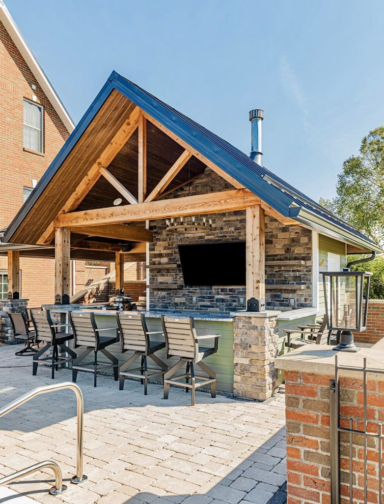 This charming poolside pavilion transforms the backyard into a true gathering hub, combining a stone-clad bar with ample seating, a built-in grill, and a shaded covered structure that keeps the area comfortable year-round. The TV mount and generous countertop create the perfect spot for summer parties and casual dinners, offering great ideas for patios that double as entertainment zones. It’s a family-friendly design that feels welcoming and functional, with a layout that encourages guests to linger, chat, and enjoy the water just steps away.