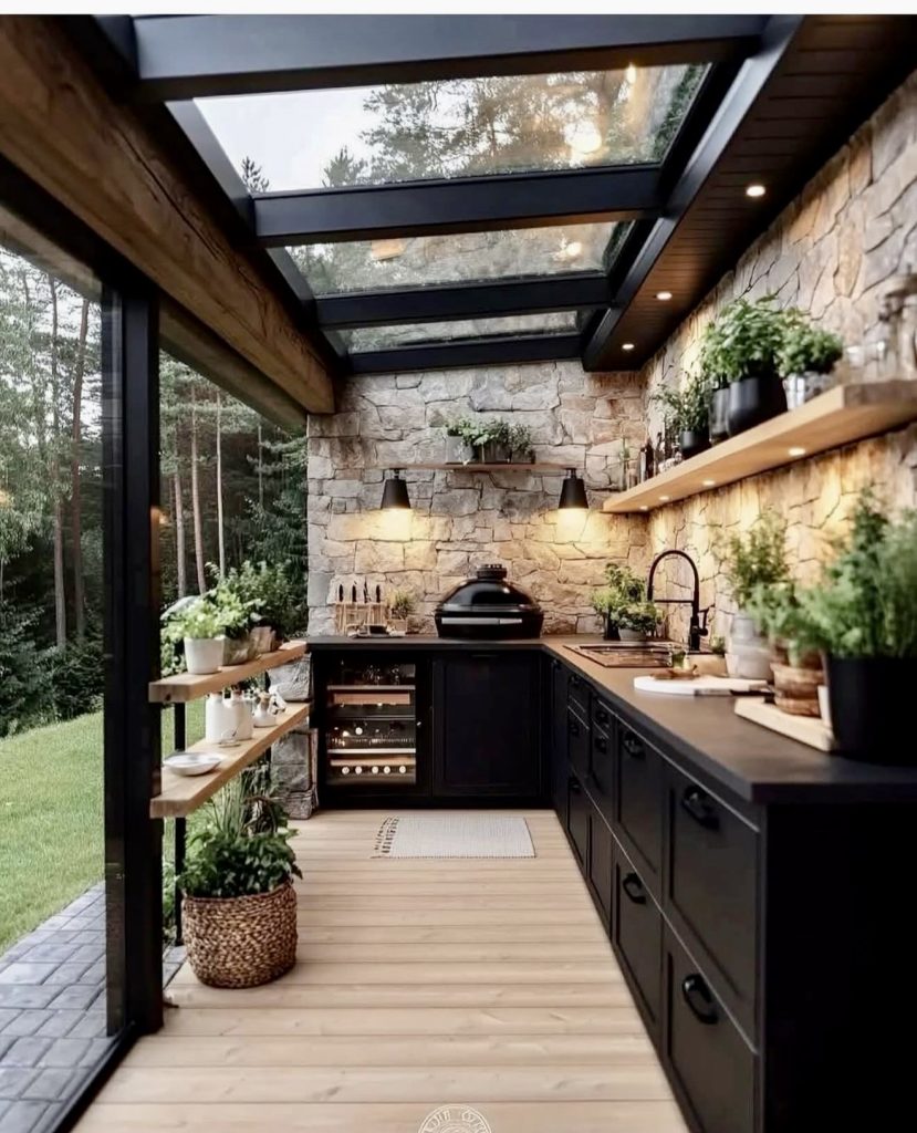 This design captures the magic of cooking outdoors while still enjoying the comforts of an indoor kitchen, thanks to the dramatic glass roof that creates a bright, greenhouse-like feel. The matte black cabinets anchor the space, giving it a refined, modern edge, while open shelving and abundant herbs add warmth and character. It’s an excellent reference for homeowners wanting ideas that blend natural forest surroundings with contemporary finishes—especially those considering a sturdy covered structure that still delivers plenty of natural light.