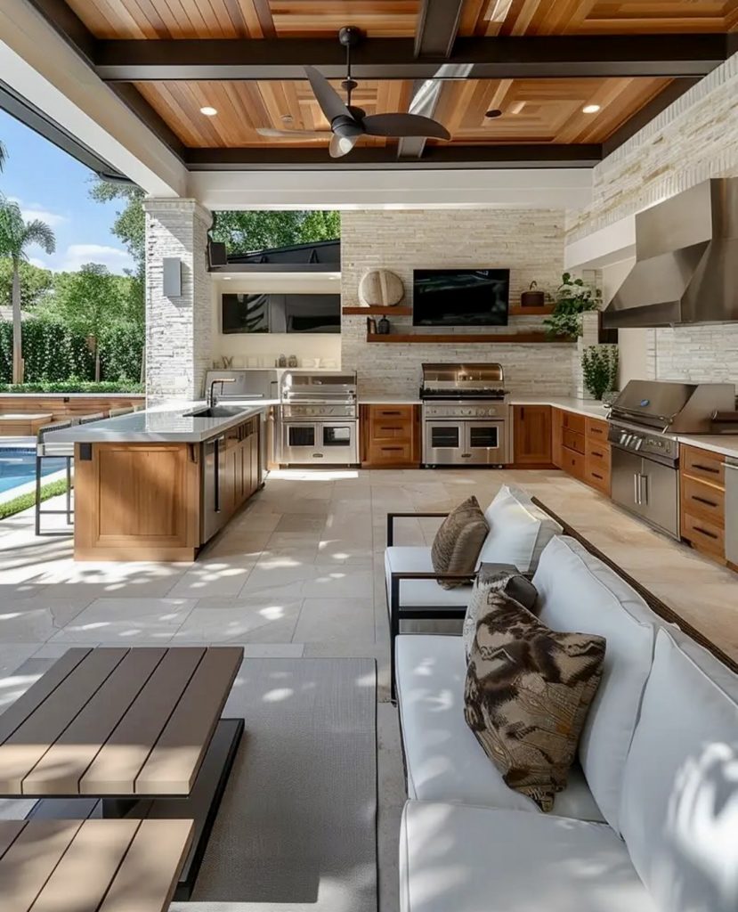 This is where design and comfort intersect. The idea of combining a cooking station with a lounge area under one covered roof has become a defining trend in backyard projects this year. There’s a rich mix of wood, tile, and stone that brings a rustic sophistication without slipping into farmhouse overload. It’s a layout that invites you to spend the whole evening outdoors—from grilling to after-dinner relaxation. What I personally love about this design is how warm and cozy it feels while still being completely open to the landscape. If you’ve ever dreamed of creating a hospitality-style entertaining area at home, this is proof it works—even on a budget. A thoughtful placement of a sofa creates that “living room outside” effect designers like to reference when talking about next-gen outdoor planning.