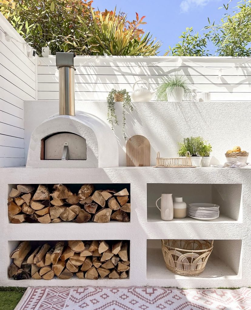 This sunny outdoor setup blends Mediterranean charm with clever functionality, making it a dream for anyone craving a compact but stylish pizza oven station at home. The crisp white stucco, built-in wood storage, and minimalist shelving create a clean layout that feels especially inviting in a small space, proving you don’t need a huge yard to enjoy thoughtfully designed cooking areas. Organic textures—woven baskets, simple ceramics, trailing greenery—add warmth, while the structured cubbies subtly echo modern ideas for patios that favor durability and low maintenance. It’s a great example of approachable design that feels premium without trying too hard, perfect for weekend cooks and design lovers alike.