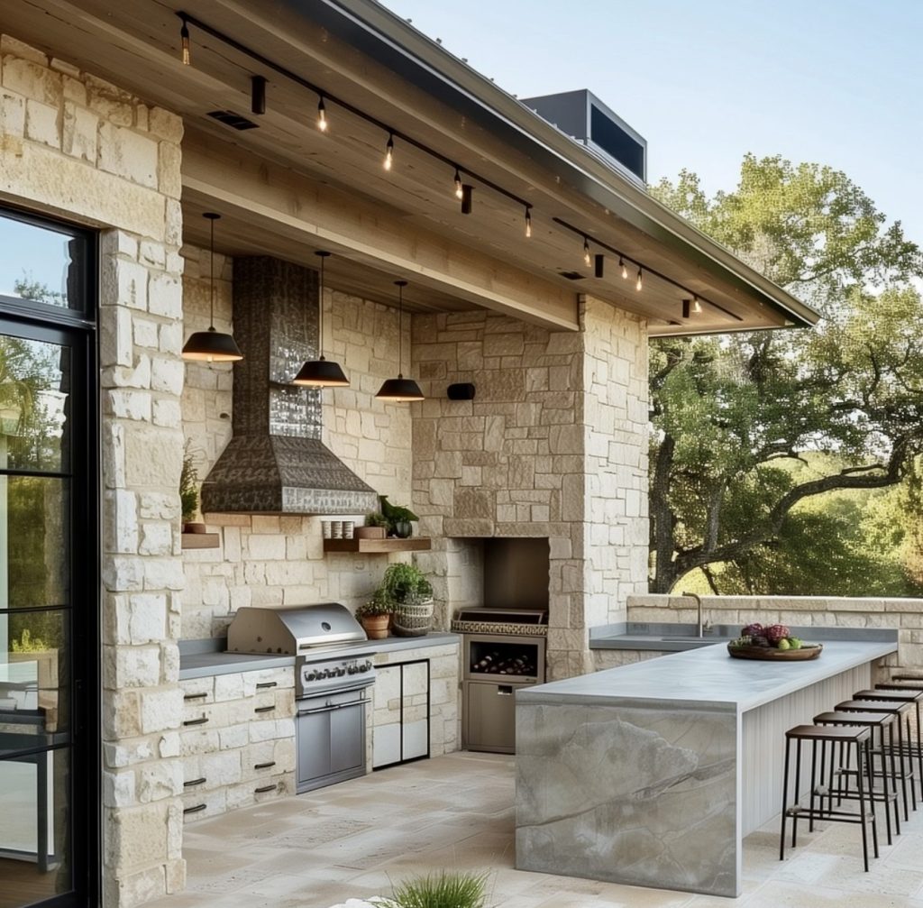 This impressive stone-clad outdoor kitchen captures true luxury, balancing rustic textures with sleek modern finishes in a way that feels incredibly current for 2026. The oversized metal hood acts as an architectural focal point, while the long waterfall island defines the layout and provides generous seating for gatherings of any size. With its built-in firewood niche, premium appliances, and thoughtful lighting choices, the space leans into high-end Texas Hill Country aesthetics while still offering practical backyard BBQ ideas and layout inspiration for homeowners who crave sophistication without sacrificing functionality. It’s a great model for anyone planning a long-term investment in their outdoor living area.