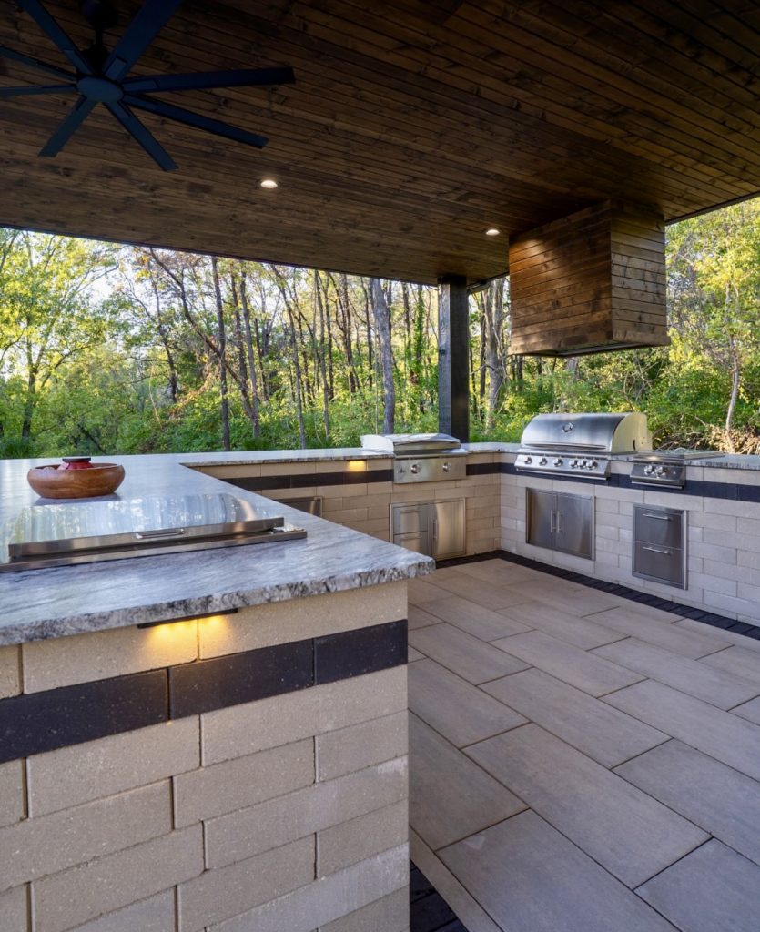 This design marries durability and style by using cinderblock construction as the foundation for an outdoor kitchen that feels unexpectedly warm thanks to its wood-wrapped ceiling and natural surroundings. The long U-shaped layout of the grill area plan supports grilling, prepping, and serving without crowding, while the ambient lighting softens the structure’s rugged materials. It’s a smart example of how a semi-enclosed kitchen can feel protected yet remain entirely open-air, especially for homeowners who want a low-maintenance setup that blends into a wooded setting. The overall look is quietly modern and ideal for those who enjoy cooking outdoors well into the shoulder seasons.