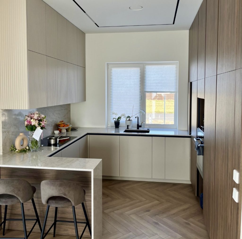 The efficient and well-organized design is a critical aspect of this compact U-shaped kitchen. The simple-looking white cabinetry is completed with a touch of elegance through golden hardware and fixtures. Thin window coverings ensure that natural illumination is not compromised. The herringbone-style floor adds texture to this compact space. The subtle organization features in this compact space to ensure that all its storage is optimized. It is perfect for a city apartment. The simplicity in this compact space proves that kitchens in 2026 can benefit from less and more.