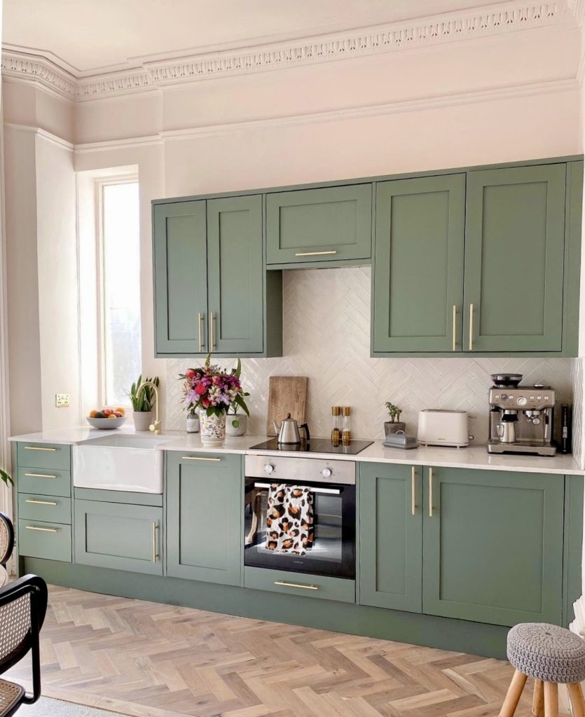 In this design, Shaker-style cabinets in a muted earthy green are a great design and decorating choice. Further added are herringbone floors and a white subway-tile backsplash. The addition of gold pulls and a white apron-front farmhouse sink is a welcome addition. The design has one wall that has enough room for a coffee and cooking station without sacrificing countertop design. Therefore, this is a design that combines traditional styles with ideas of a modern kitchen. The end result is a great example for those people looking to undertake a redesign in 2026.
