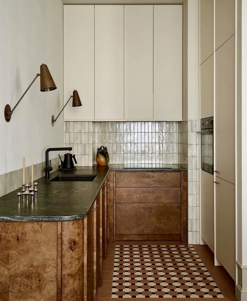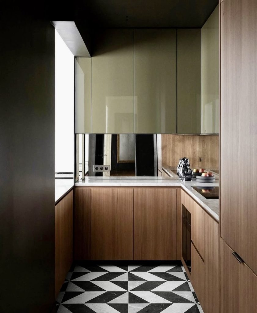 In this small kitchen design example, you can observe a perfect blend of geometric elements and simplicity. The wooden cabinets have added a natural touch to this compact space. The glossy top cabinets provide a contrasting effect to this compact space. The black and white floor has added a graphical touch to this compact space. Make your compact kitchens even more compact and trendy with ideas that can perfectly implement in a 2026 home.