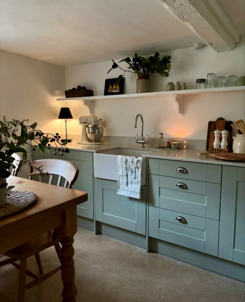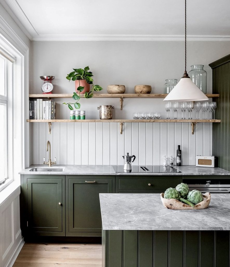 In this design idea for a small kitchen, a small island has been placed for additional cooking and meal preparation. The wooden cabinets painted in a soft and natural shade of green add natural and earthy personality to this decorating project. The gray natural stone countertops add a fresh and natural personality to this decorating endeavor. Open shelving in this decorating project brings a touch of natural and fresh personality. The vertical strips in this decorating endeavor add a natural and fresh personality. Hand-picked decorations like vases and crockery work as an added decorative touch on top of this wooden surface. “This is a fantastic example of a modular design that is perfectly considered for a small space.”