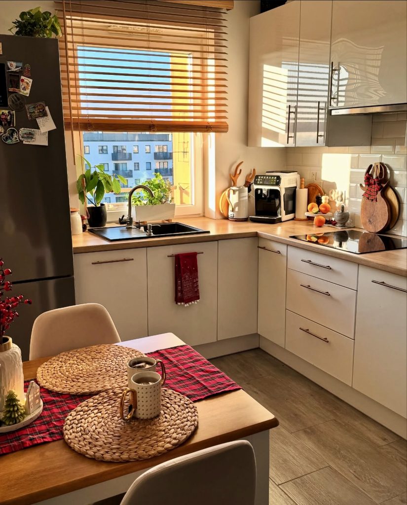 With plenty of natural lighting in this kitchen, it proves that even a small space can have a generous feel. The white cabinetry is reflected in the sun’s rays in this pic. Wooden countertops and blinds add warmth to this white cabinetry. The diner-style corner table and placemats are a genius decorating idea and are a small apartment decorating solution for both cooking and dining. The layout is streamlined and focuses on cooking and organization. Plant life and seasonal decorations on the counters add a welcoming touch.