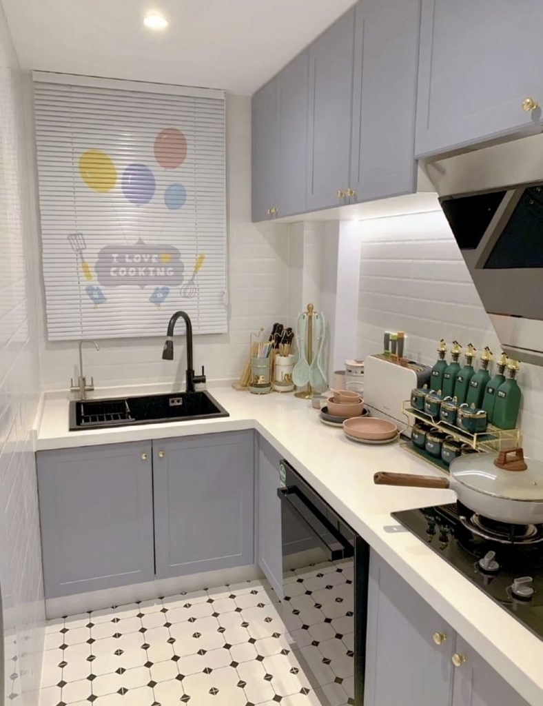 In this design idea for a small kitchen, pastel purple blue-colored cabinetry brings a touch of fun and personality to this space. Along with white counters and a white backsplash, this pastel-colored cabinetry brings a fresh and airy feel. Compact shelving and a well-organized spice rack are features that promote brilliant organization ideas and ideas for a small apartment. The floor in this design idea for a small kitchen brings a bold personality to this decorating project.