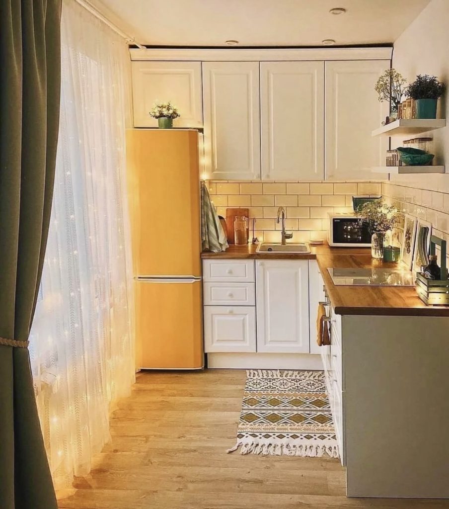 In this design idea for a small kitchen, a splash of yellow paint on a refrigerator brings a fun and happy touch to this decorating endeavor. The white cabinetry and subway tiles on this wall provide a significantly contrasting yet fresh and airy feel. The wooden countertops add a natural and earthy feel to this decorating project. The fairy lights and plants add a cozy and woody personality to this decorating task.