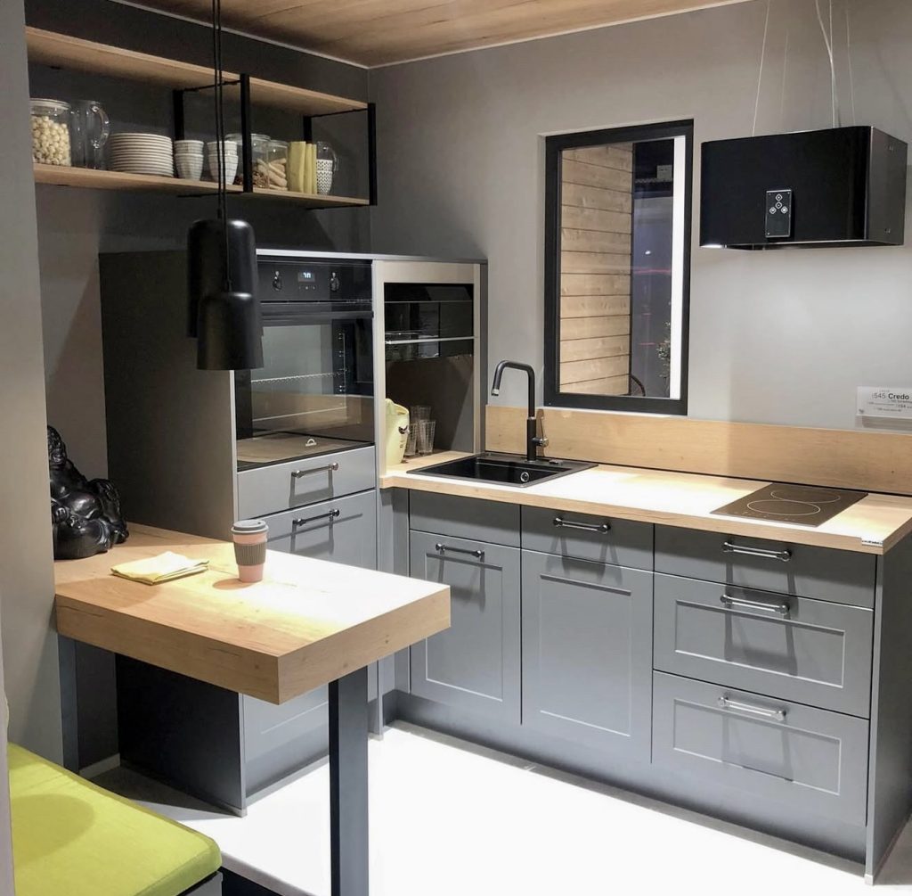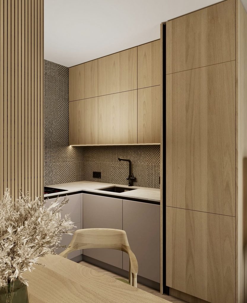 In this design for a small apartment kitchen, you are applying different textures to make this place look stylish. The wooden finishes will perfectly blend with your perfectly placed interior lighting. In this interior design project, you have designed a whole storage system in all your corners. The matte black faucet will perfectly contrast with all your interior decorations. Your design ideas have even made all your interior spaces a place to sparkle.
