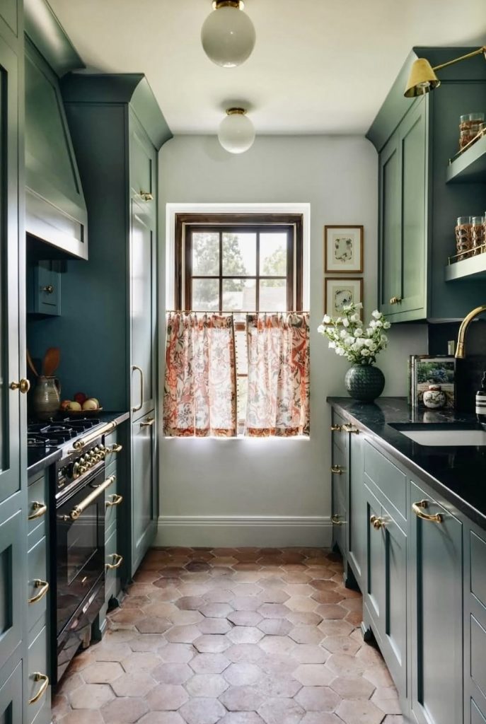 In this compact galley-style kitchen example, a well-considered design ensures that this small space looks and feels cozy and efficient. The dark-colored cabinetry is enhanced with golden metal in its pulls. The terracotta-colored floor is a critical addition to this compact space. The floral curtain hung over this window is essential in making this compact space feel cozy. The dark-colored countertops add a touch of sophistication and elegance to this compact space. This compact space is critical in offering a large personality in a small space.