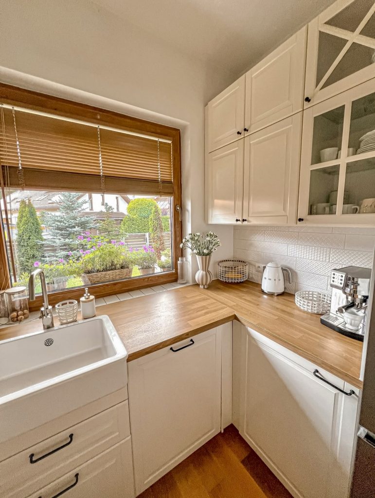 The compact U-shaped kitchen features a well-considered white cabinetry that features cookware and dishware on its top. Compact white cabinetry and a well-considered wooden top are critical in making this compact space feel cozy and relaxing. The white cabinetry features a touch of elegance created through natural-colored wooden countertops. The compact space features a classic white design that is enhanced with natural wooden countertops. The wooden countertop is essential in creating a touch of warmth in this compact space.