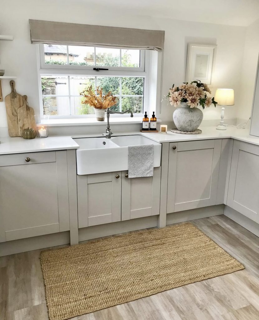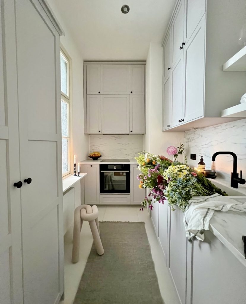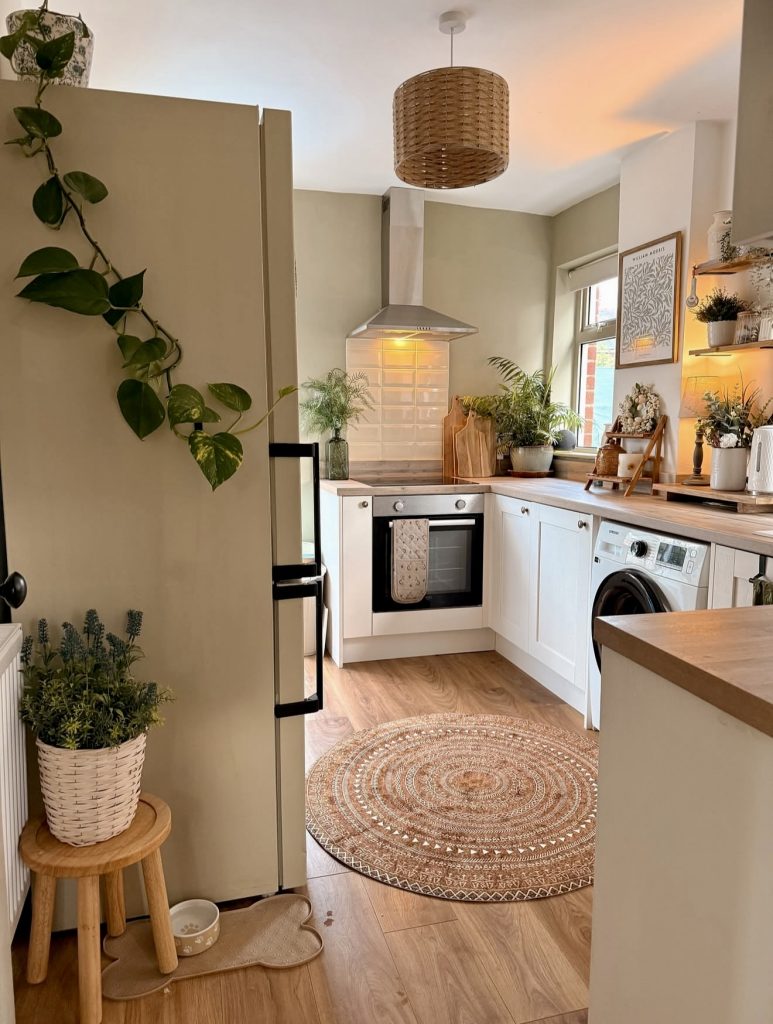 In this small kitchen, natural elements like earthy colors and plants are incorporated in a natural and fresh way. The white cabinets ensure that this small space is filled with natural light. In addition to this, the round jute rug has added a natural and aesthetic touch to this small space and converted it into a cozy one.
