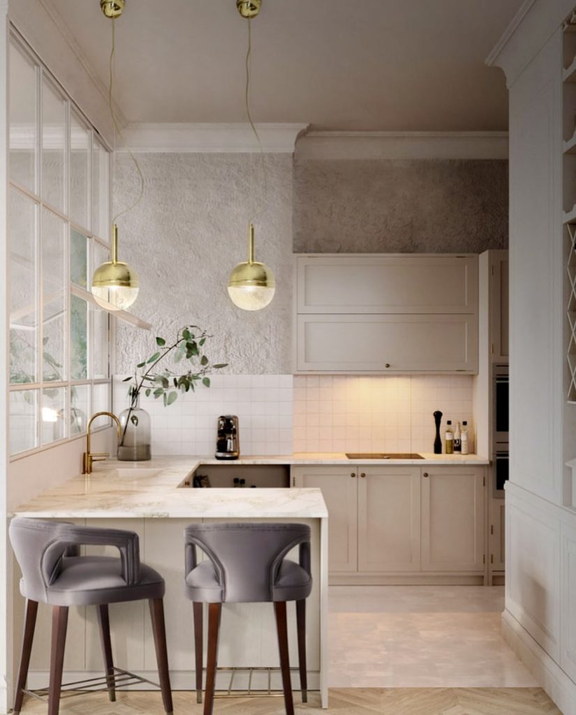 Staying within a compact city apartment and its respective compact kitchens, this elegant design combines soft pastels and luxurious elements to achieve a sophisticated look. The installed peninsula in this compact space has played a vital role in designing a workspace and a dining area. The installed counters made of marble have given a luxurious touch to this compact space. The elegant-looking barstools have added a luxurious touch to this compact space. In this article, you can find out how to design a compact space like a perfect city apartment.