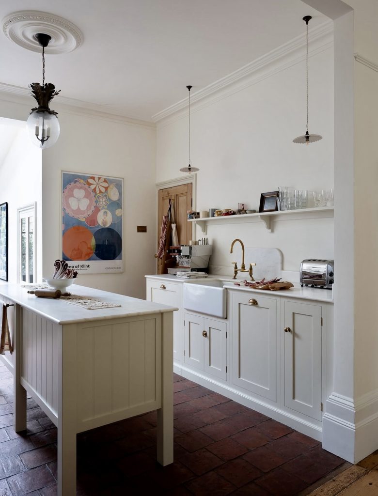 Timeless and useful in its design elements and organization ideas in a small space is this example of a home kitchen that features a central table and is designed for a small home that needs either a place for meal preparation and/or a sitting area. The white and metal finish are elegant in this small space while the brick floor is a grounding note. The location of open shelving above a sink is a common place in this small space to balance organization ideas and decoration. The perfect display in ideas for those that need a traditional and budget-style interior.