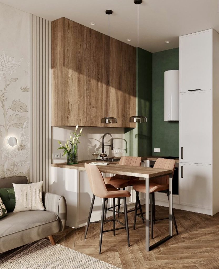 In this small space that is a combo for a living room and a compact kitchen comes a design example that has made strategic decisions in this compact space in a modern apartment. The wooden cabinets and deep emerald-colored walls provide a warmth to this small space while offering enough surface space through a larger counter that serves as a table for final meal preparation and a place for sitting. The perfect example for organization ideas that use a surface for more than one reason. The example for interior and functionality for life in 2026.