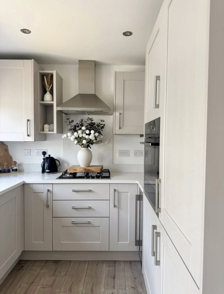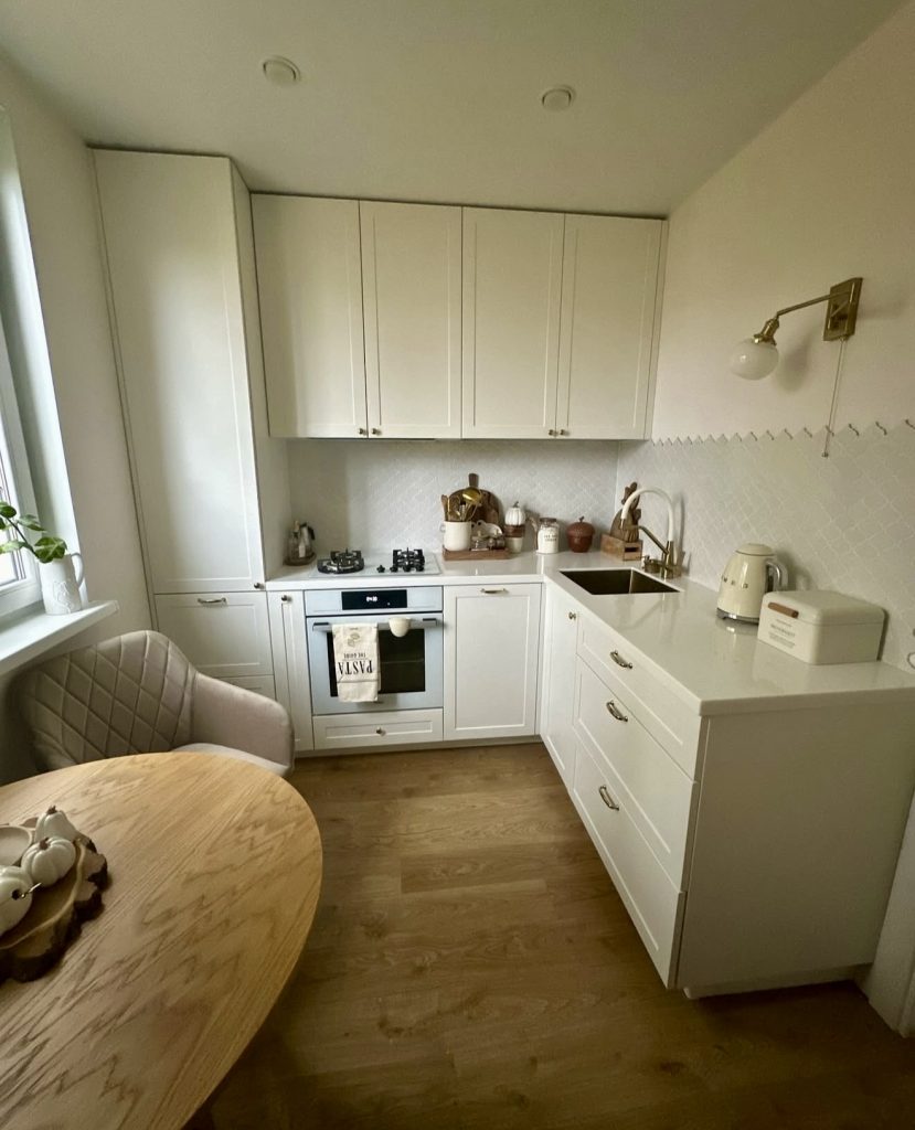In this design example above, it is possible to identify how a white theme can have a natural amplification effect when it comes to natural lighting in a small space. Modern storage and decorating ideas are perfectly complimented with a wooden floor. The addition of natural decoration ideas and a windowsill garden will encourage fresh ideas when it comes to organization and decoration. Everything that a small kitchen needs is that this design is in line with all the ideas that were recommended for a small kitchen in 2026.
