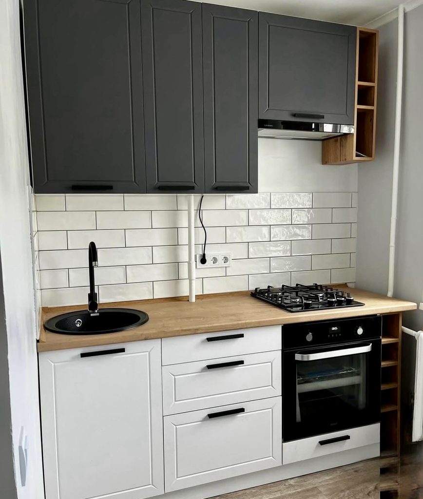 The black and white contrast color makes this one a distinctive example of an innovative and bright interior. The white and black lower and top cabinets and wooden countertops ensure a cozy atmosphere. Subway tiles contribute to a well-organized and cozy interior that is a great example of how a small interior can provide a cozy and well-organized interior.