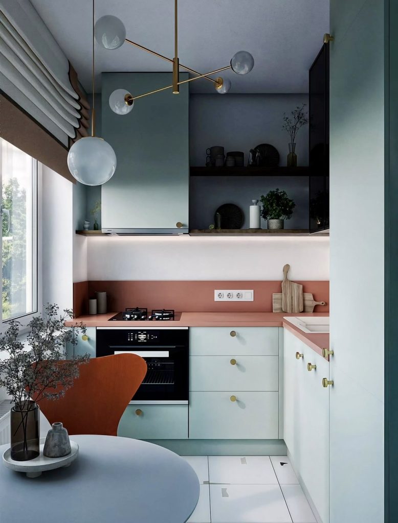 In this innovative and charming interior design example, a pastel-colored kitchen has a gorgeous color palette and a fun design that is a brilliant example of how a small interior can provide a fun atmosphere. Brass metal details ensure a cozy interior and a fun cozy atmosphere. Open shelving is a great example of innovative interior design ideas. It is a brilliant example for small kitchen ideas in 2026 that can provide a fun atmosphere.