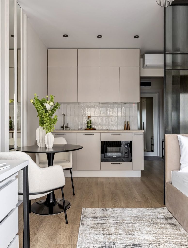 In this innovative interior design example for a small studio apartment interior design, a cozy atmosphere is created through a neutral-colored interior that has a simple and compact interior design. The interior is a brilliant example of how a fun and cozy atmosphere can be created in a compact interior design. The compact interior design is a great example of how a small interior can provide a fun atmosphere that has a compact and cozy interior.