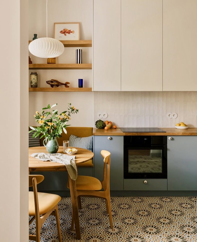 In a retro-style home that has absorbed interior design ideas from really diverse inspiration sources, this is a different kind of kitchen design that combines retro and modernization. The blue-colored lower cabinets are paired with wooden shelving to produce a natural and earthy effect inspired by Indian interior design tastes. The floor tiles have a different and special design that makes this different from a traditional design. The organization ideas in this design are clever enough to ensure that this shelving is not a source of more clutter. The table ideas near this shelving ensure that this can even act as a cozy dining area.