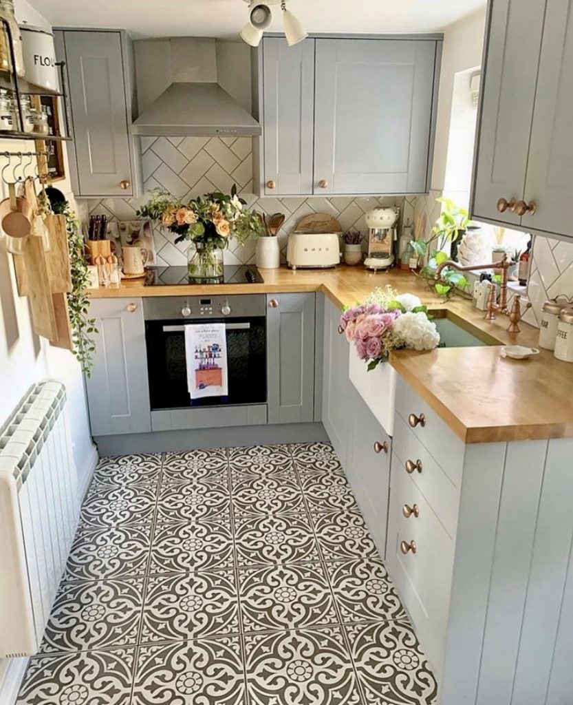 In this small apartment kitchen design ideas are given a boost. The blue-colored cabinets are a beauty to behold when paired with wooden countertops. However, it is not this but its floor tiles that steal the imp. The effect and design are bold and timeless and add personality to this space without making it crowded. The organization ideas are evident in this setup as it has a combination of wall-mounted hooks and wall-mounted shelving that ensure that all utensils can easily reach but are not mixed between.