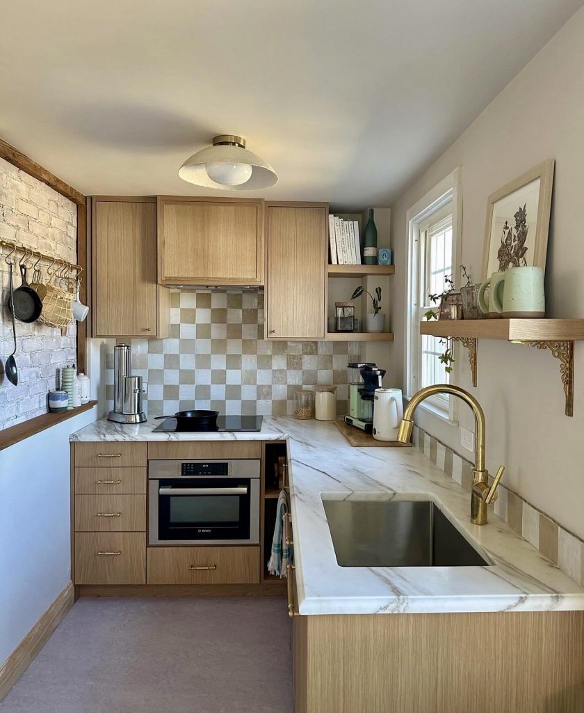 In a small galley-style kitchen that is not much to look at either in its length and width but has a single window for more natural illumination and larger space in its shape in one wall for more storage and preparation dinners and lunches that are made in this setup are given a fresh spin with its checkered tiles and wooden-colored cabinets. The addition of a golden faucet in this setup is a touch of elegance. Open shelving allows you to display your goods in a carefully designed fashion — cookbooks to china. The beauty of this ideas design is that you can achieve a sophisticated look even with humble materials and pantry organization ideas through strategic countertop design.