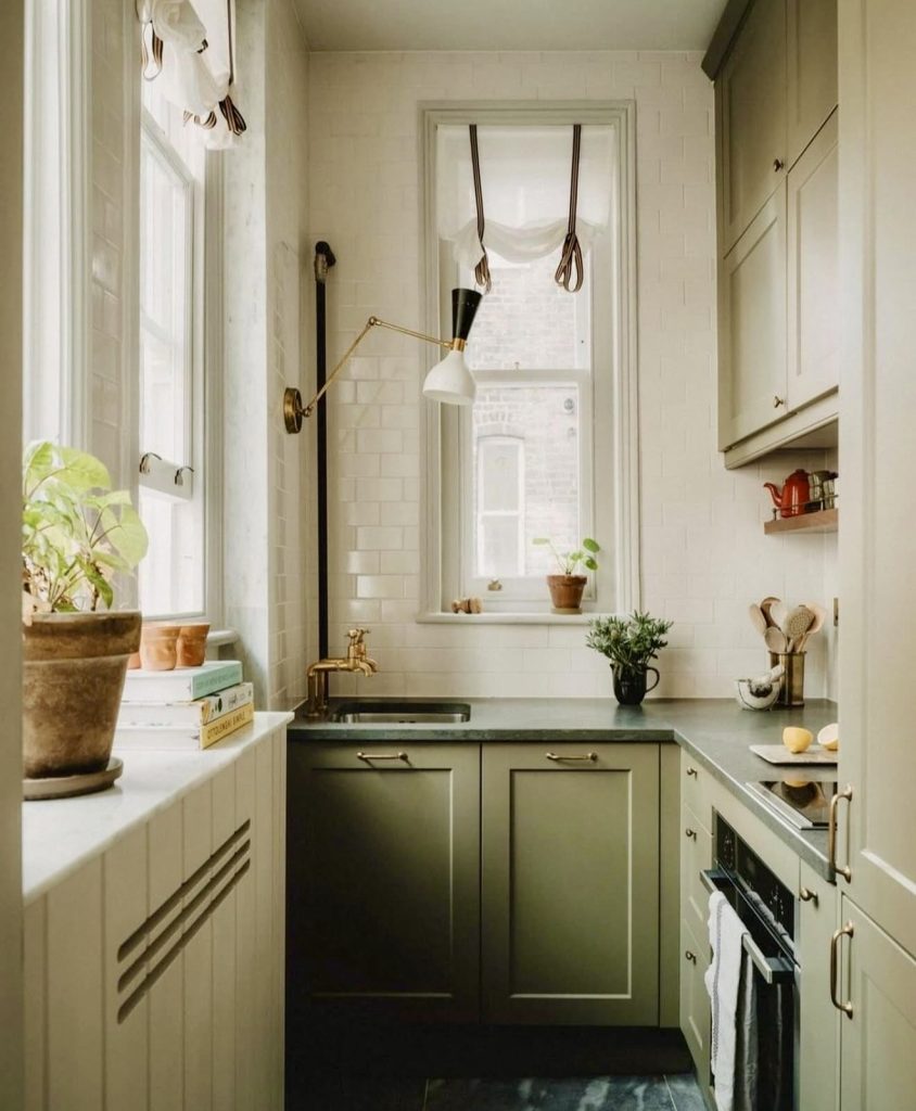 Sometimes, it is not actually a complex design that fascinates. Just take a look at this narrow ideas design. The earthy green cabinetry and brass pulls add a sophisticated touch. The vertical windows in this design add excellent natural ideas for a brighter interior. The plants and wooden details ensure that this compact space is cozy. The key to a successful compact design is when your ideas for organizing and decorating blend perfectly.