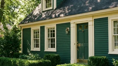 This home stands out with its classic combination of muted green siding and contrasting white trims, offering a timeless and approachable exterior. The porch area with dark brown shutters provides the home with a cozy, inviting look. Choosing neutral colors like soft green with white trims creates a comfortable and welcoming atmosphere, perfect for those looking for paint colors ideas that are both stylish and practical. Incorporating landscaping like small shrubs or decorative lighting can further elevate the home’s curb appeal and give it a polished, finished look.