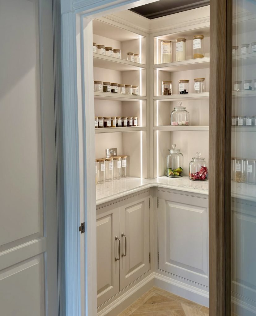 The hidden pantry concept is accentuated, concealed by cabinetry. In soft neutral tones with marble countertops, it gives off an air of refinement; the accent shelving illuminated by LED lighting adds to its organizational appeal and style. The uniformity of glass jars keeps excellent organization ideas for spices and dry goods; it looks as if it belongs to a high-end boutique. There is a method behind the dimensions. This layout does wonders to convince that even the tiniest pantry layout can look glamorous when every detail has been well thought-out.