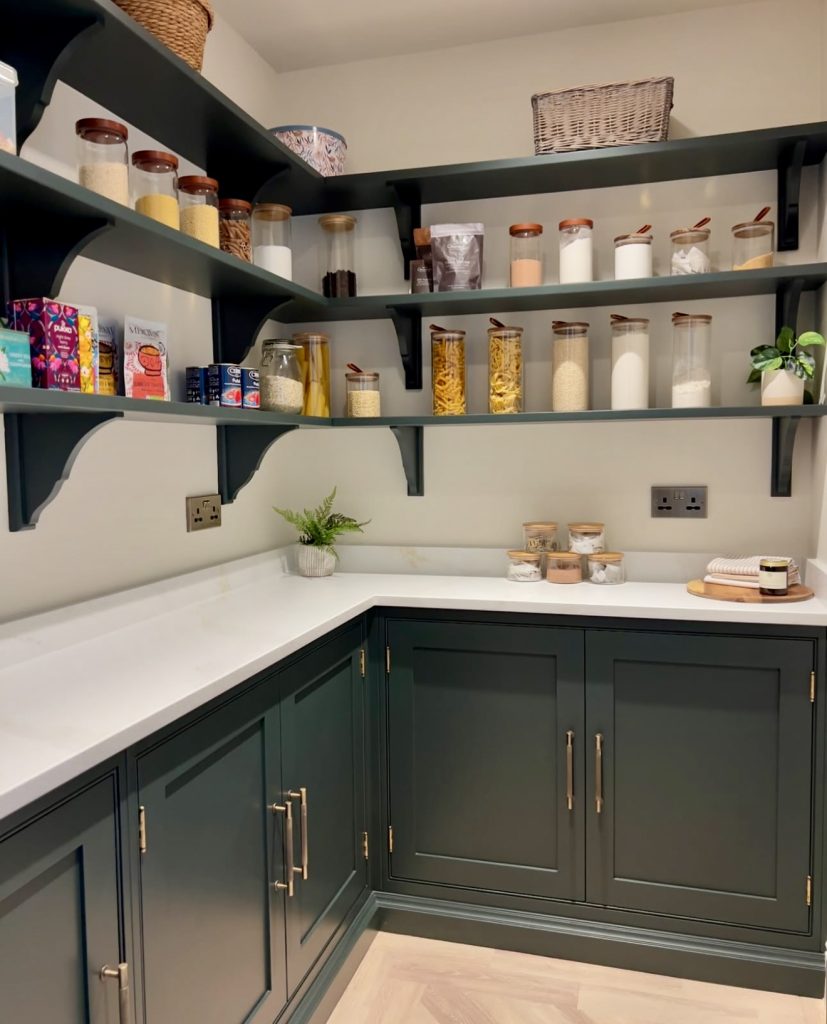 This pantry blends modern cabinet ideas with a classic color palette. Deep green lower cabinets paired with open shelving ideas offer both concealed and accessible storage. A clean countertop creates a dedicated appliance counter for small kitchen tools or a compact coffee station, making it a practical extension of the main kitchen. Brass hardware adds warmth, while thoughtful organization through jars and baskets makes daily use effortless. This kind of layout has become increasingly popular in American homes where style and efficiency go hand in hand.