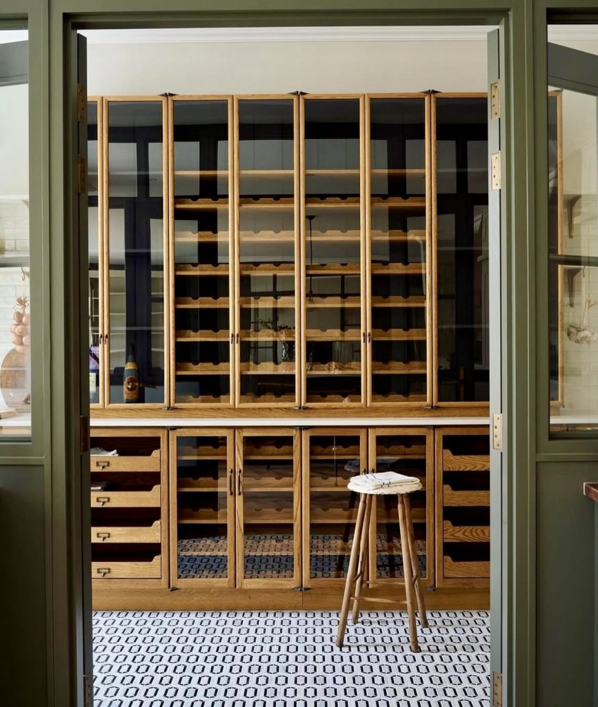 This stunning space reimagines the walk in pantry layout as a dedicated wine and dry goods room. Floor-to-ceiling shelving behind glass doors creates a striking architectural feature while keeping the contents dust-free. The rich wood tones contrast beautifully with the sage green framing, offering both hidden and display-focused storage. Clever organization ideas ensure every bottle and drawer has a purpose, making this ideal for those who love entertaining. The patterned tile floor gives a nod to vintage European scullery ideas, tying the design together elegantly.