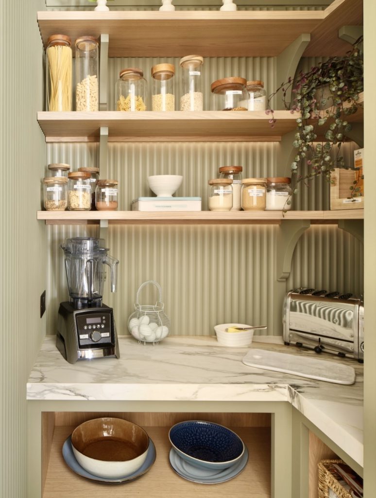 This pantry takes a modern approach to compact spaces, showcasing how to use vertical shelving ideas effectively. Slim wood shelves pop against a fluted green backdrop, while a marble countertop doubles as an appliance counter for blenders and toasters. Clear glass jars line the shelves for streamlined organization, keeping ingredients in full view while maintaining a clean aesthetic. This tiny layout is a perfect example of how thoughtful design can make a small pantry feel spacious and functional.
