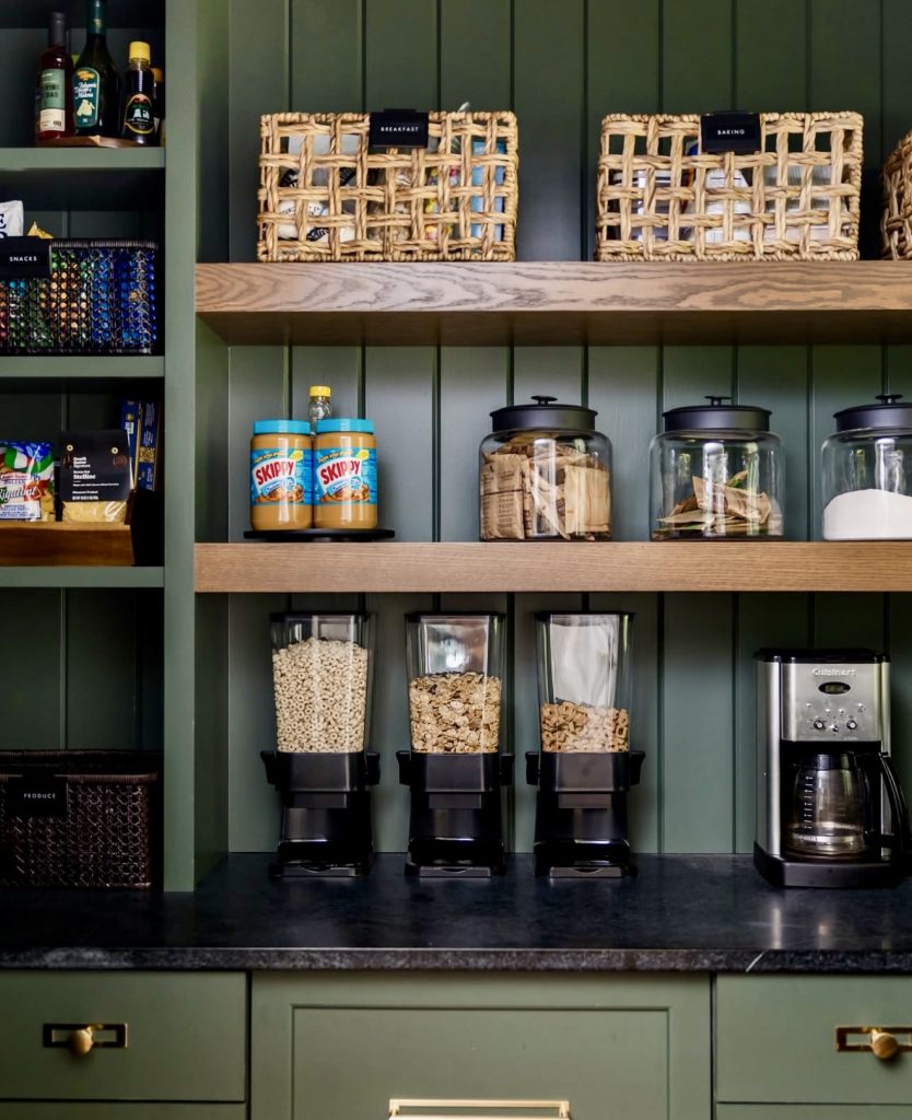 For households that run on morning routines, this pantry embraces the concept of a coffee station and breakfast zone. Woven baskets labeled for “Breakfast” and “Baking” create intuitive organization ideas, while cereal dispensers on the countertop offer hotel-style convenience. The dark green paneling gives it a cozy farmhouse feel with a modern twist, while open shelving ensures everything from coffee beans to peanut butter is within reach. It’s a clever layout for busy families looking to simplify their mornings.