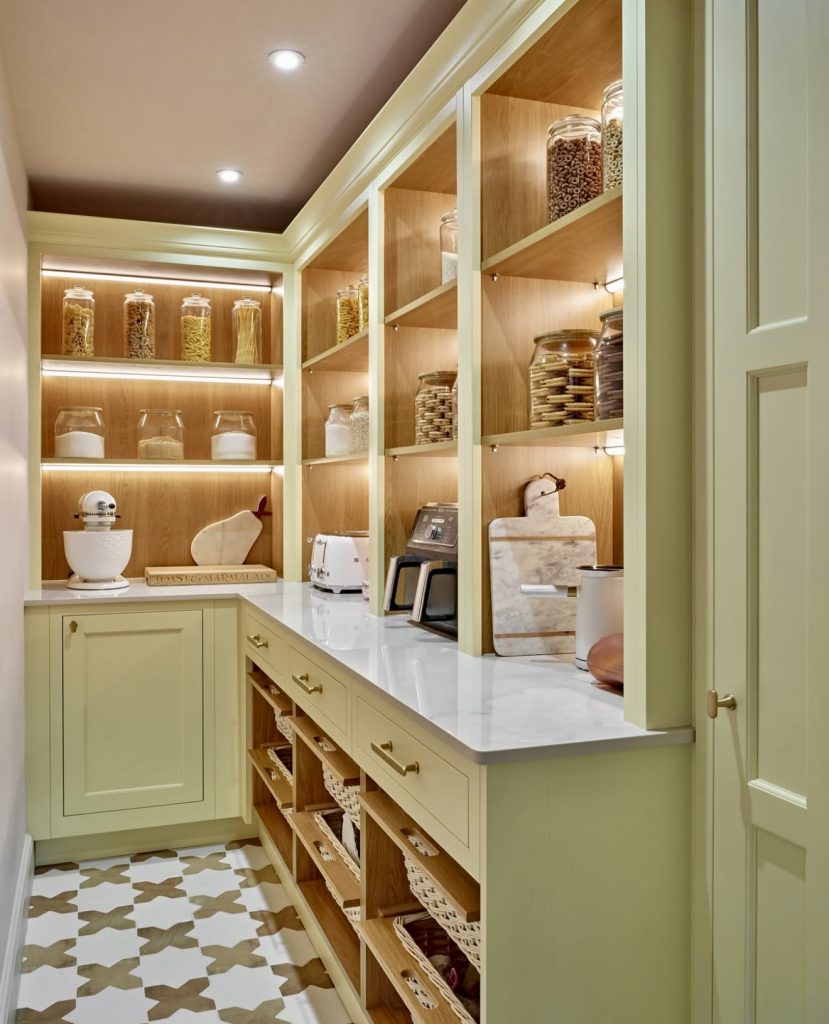 This walk in pantry proves that color can transform functionality into a statement. Pale yellow cabinet ideas combined with oak accents and built-in shelf lighting create a cheerful yet sophisticated look. Deep drawers and open cubbies below the countertop provide flexible organization, while open shelving ideas above highlight jars and kitchen essentials. The narrow layout is cleverly designed, making this pantry feel large and bright despite its compact dimensions. Designers often point to subtle color choices like this as a way to bring personality into storage spaces.