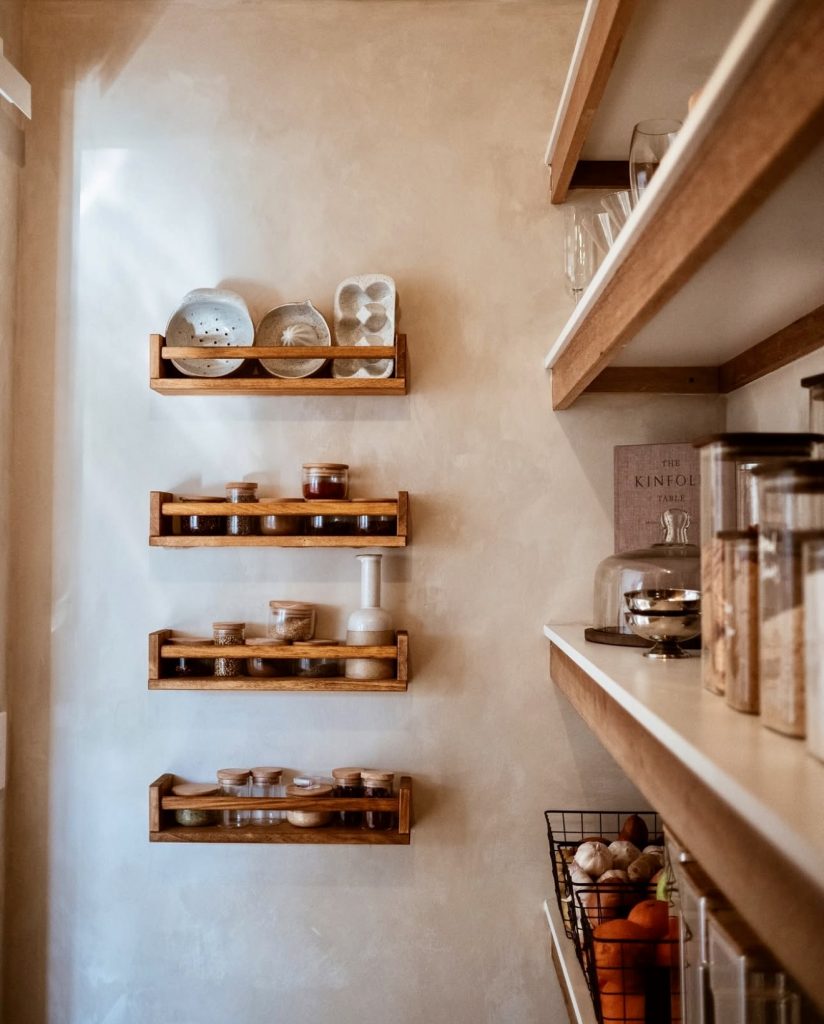 Minimalist yet deeply functional, this pantry uses a mix of floating wooden spice racks and wall-mounted shelving to maximize vertical space. The earthy plaster walls evoke a Mediterranean feel, creating a unique backdrop for ceramics and jars. By keeping the layout simple and uncluttered, this design offers easy access to essentials while maintaining visual calm. It’s a clever solution for those who prefer a tiny pantry that still feels curated, leaning into timeless organization ideas that don’t rely on bulky cabinetry.