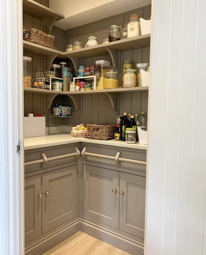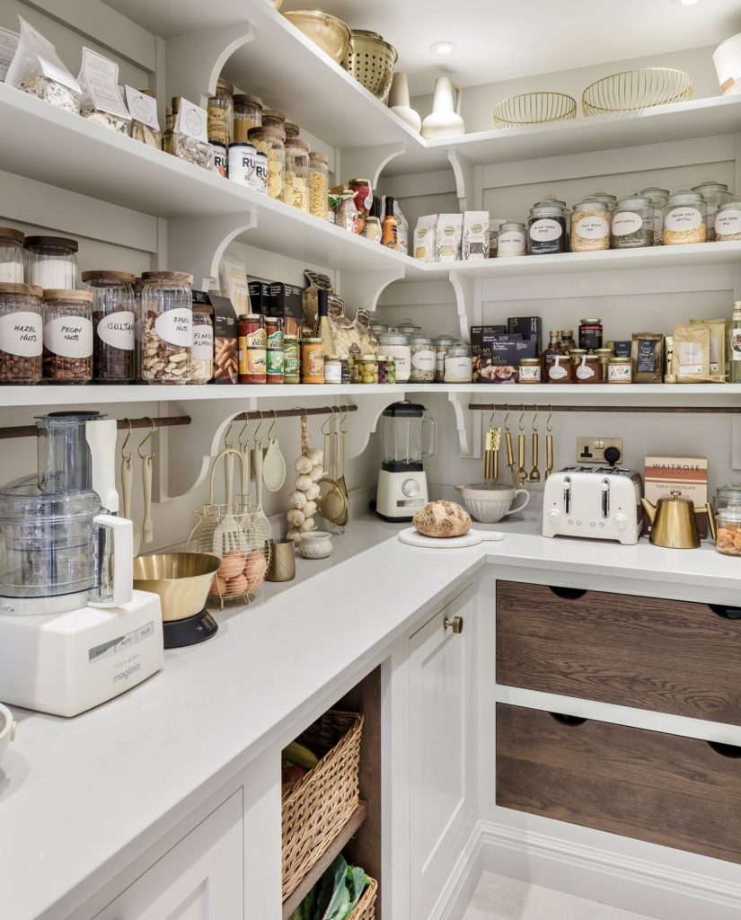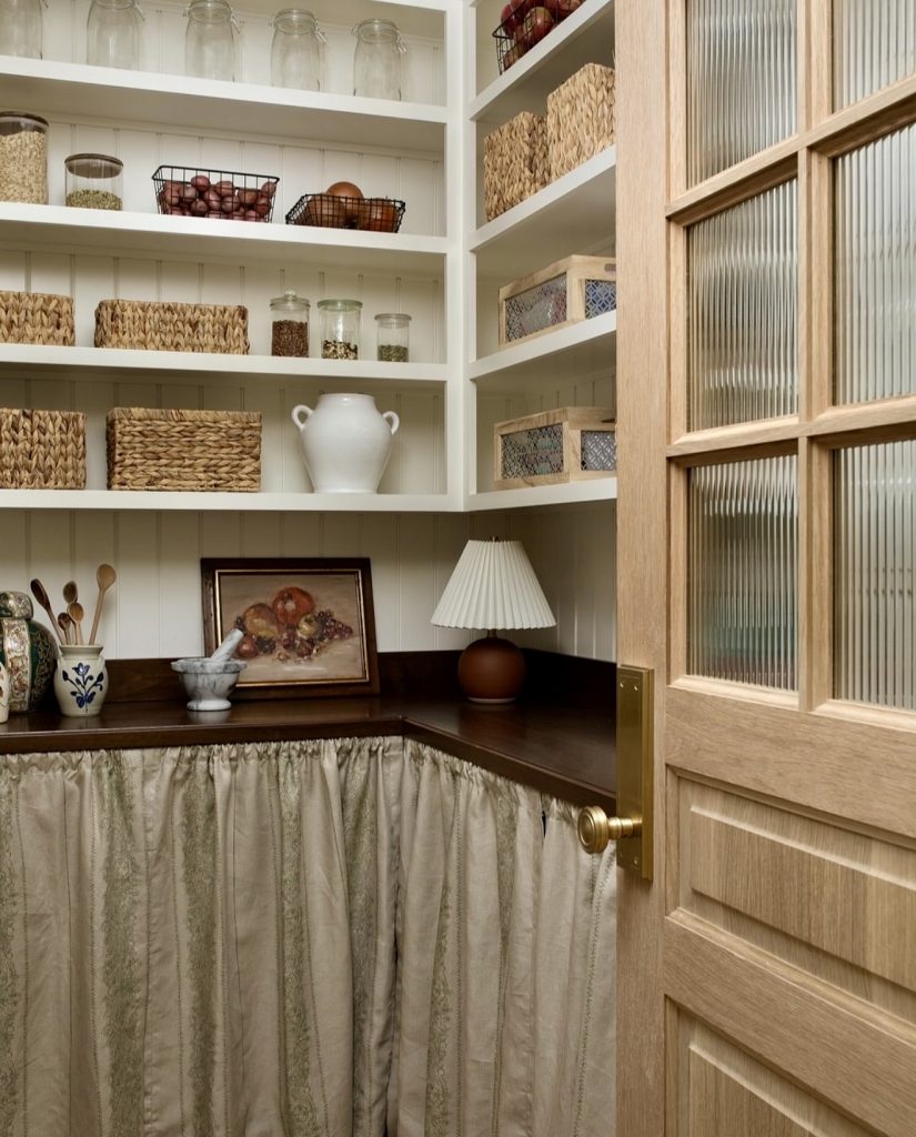 Cozy and practical, this walk-in pantry adopts a warm taupe color scheme and traditional shelving brackets for a timeless appeal. Its countertop is useful for unpacking groceries or employing small appliances, with layered organization ideals offered by jars, baskets, and net bags. This humble pantry says that good cabinetry ideas, along with the efficient use of space, can truly ease day-to-day cooking without any sacrifice of charm.