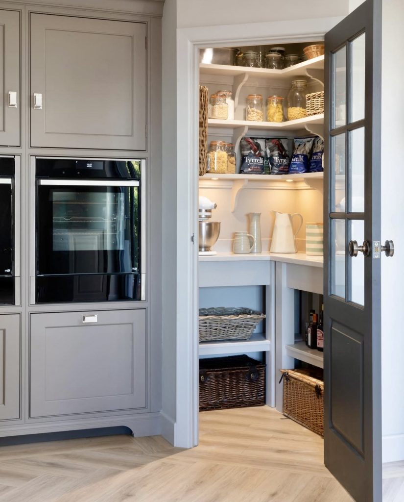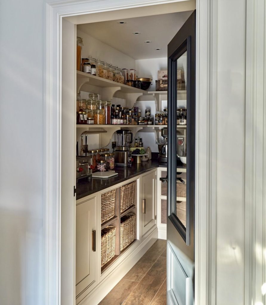 Tucked cleverly by built-in ovens, this hidden pantry illustrates that efficient use of a layout can be a key feature in a much smaller home. Soft neutral colors, layered shelving, and warm lighting work against create a welcoming feel in the space, while baskets, jars, and containers keep things neat and tidy. This tiny space is a great example of how to store efficiently if you want a kitchen storage area that won’t disrupt kitchen flow. It’s a subtle yet transformative addition for a smaller kitchen.
