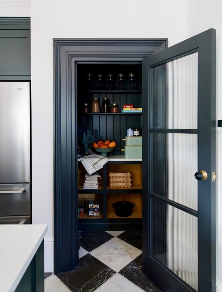 Black millwork contrasts strongly with checkered flooring, making such a statement for this contemporary pantry. Glazed door creates transparency with open shelves made for easy access—are typical stuff. The countertop is provided for folding linens, produce baskets, and small appliances—utilizing even narrow dimensions to the fullest. The calming colors trending in the interior design world will ensure that such a pantry will be both functional and fashionable-the perfect choice for anyone who favors a luxe, contemporary home look.