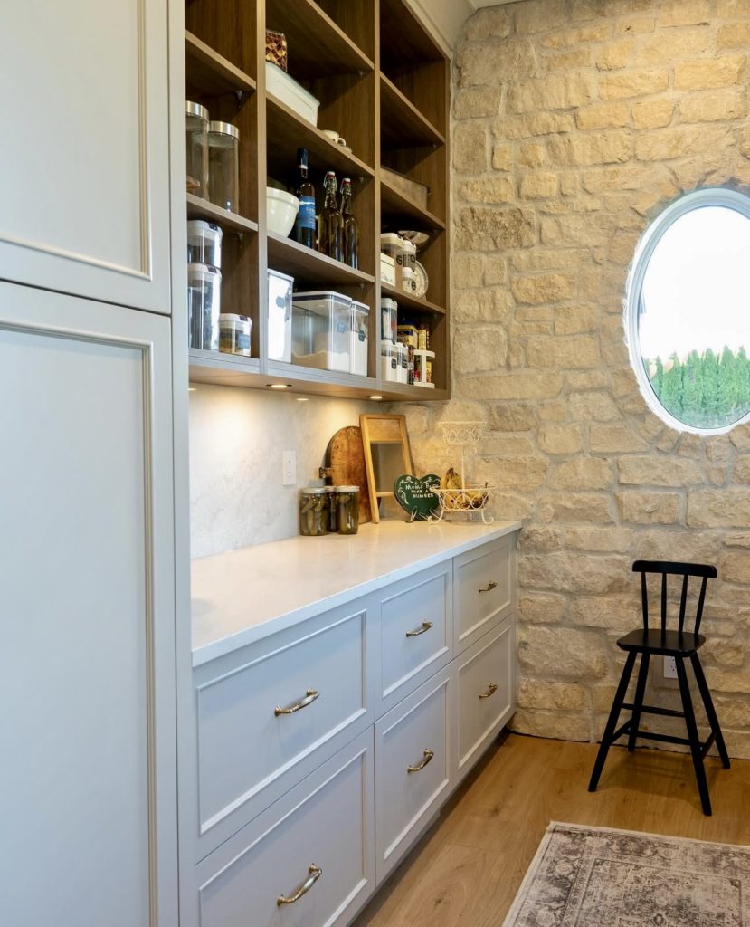 It blends modern cabinetry with rustic textures. This pantry brings forth scullery ideas inspired by European kitchens. Deep drawers balance out the open shelving idea for maximum organization, while the round window is integrated into the layout to flood the space with light. In contrast, the warm stone wall recalls timeless farmhouse charm while keeping an appliance counter below the cabinets for smart little gadget and food prep zones. A truly versatile and welcoming pantry is born from combining these old-world textures with the modern cabinet ideas.
