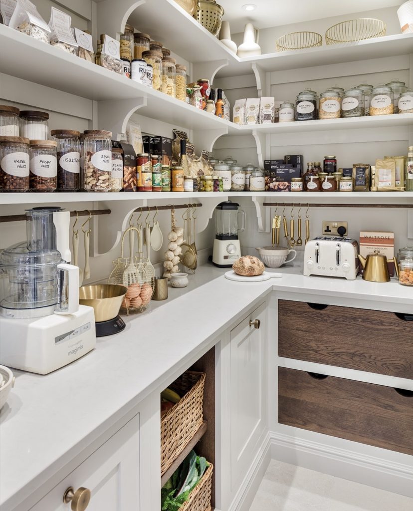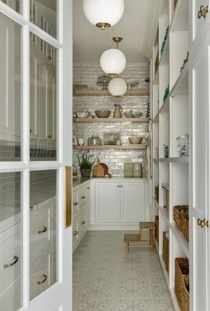 The pantry really makes a statement among the balances of wood, whites, and brasses. Wall wrapping open shelves offer ample storage for jars and dry goods, while the countertop serves as a workspace for blenders and toasters. Baskets add texture and keep things organized, and warm lighting softens the space. This balanced layout combines modern function with classic charm, making it great for both small and big kitchens.