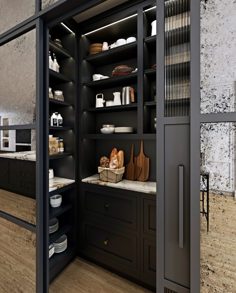 This walk in pantry builds modern style from a moody black palette, clean lines, and integrated lighting, embodying a perfect storage zone. Open shelving offers access to dinnerware and such essentials while the marble countertop acts as a prep and appliance counter. The recessed lighting enhances the drama and elegance even in the tiniest layouts; worthily, therefore, it will find its place in urban apartments or contemporary homes, impeccably hiding utility behind an eye-catching look.