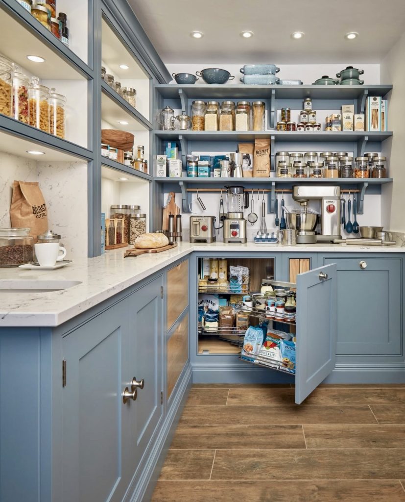 This farmhouse-style layout mixes powder-blue cabinets with white countertops and some clever built-in shelving ideas. The L shape offers open shelving for grab and go, plus deep cabinets for hiding away. Pull-out lower sections add extra organization for treats or baking supplies. This design proves how considered planning turns a kitchen with limited space into a warm and highly functional scullery.