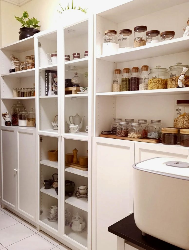 This pantry channels a minimal Ikea aesthetic, combining glass-fronted upper shelving ideas with closed lower cabinets for hidden storage. Perfectly labeled jars line the open shelves for crisp organization, while the lower section stores bulk items and kitchenware. The layout is straightforward yet highly effective, making it perfect for small apartments or homes seeking affordable, stylish pantry organization ideas that feel clean and bright.